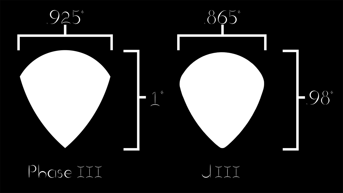 A familiar size paired with innovative shape and feel, the Phase III is the progression of classic design. The smaller form factor combined with a chiseled point allows for a greater level of precision and control. The 45° knife edge profile immediately cuts deep into the strings for a fast, articulate attack. Both sides of the Phase III body employ an ergonomic scallop in which the tips of the finger and thumb rest in. The surface of these scallops are lined with teeth like opposing grips that keep the Phase III exactly where you want it.